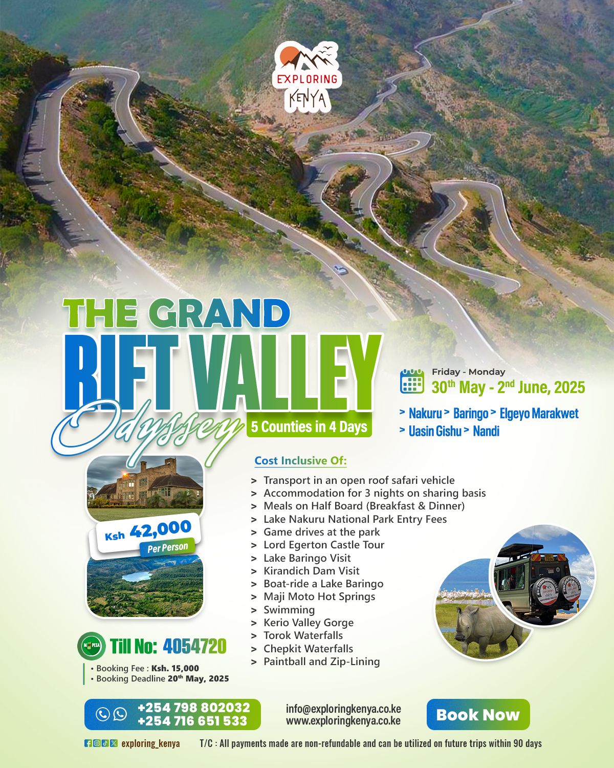 • 3 nights shared accommodation (Nakuru, Kabarnet, Eldoret)